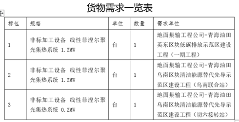 招标公告提出的技术要求为:涉及到的光热供热系统,供应商的供应数量为3 套。根据场地要求、反射镜面面积要求,英东油田接转站采购1套1.2MW 线性菲涅尔聚光集热系统,乌南联合站1套1.2MW 的线性菲尔聚光集热系统,切六接转站 1套 0.2MW 的线性菲尔聚光集热系统,每套系统配套提供 PLC 系统套,实现集热、储热、换热、装车的远程控制运行。所有现场数据均可自动上传至接转站控制室实现远程值班介入控制。要求光热供热系统供货方提供的光热供热为定型系列产品,并已经过类似现场情况的运行考验、安全可靠、配置合理,设备设计、制造要充分考虑英东、乌南地区风沙大的环境因素,对受力大的部位要进行加强处理,确保设备各部件结实牢固,抵抗大风可能对设备造成的损害,对其所提供的光热供热系统质量全面负责。